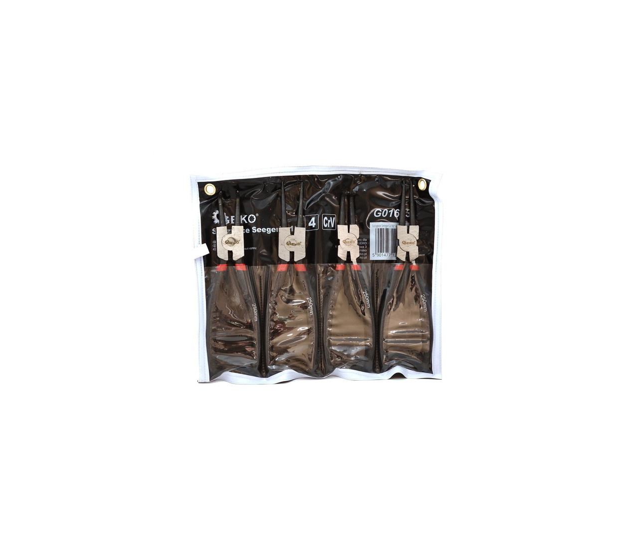 Набор клещей позволяет осуществлять сборку и разборку внутренних (расширяющихся внутри втулки) и наружных (зажимающих снаружи вала) сегеровых колец.